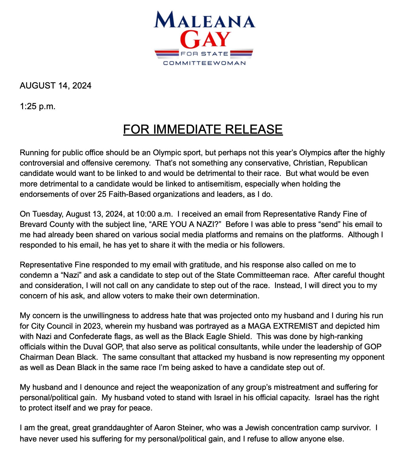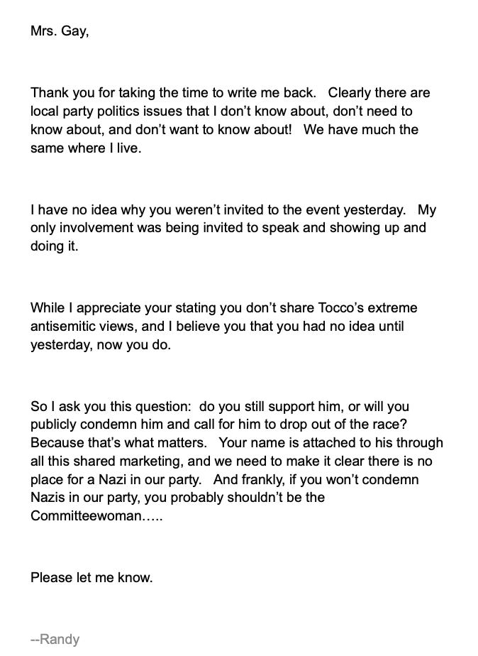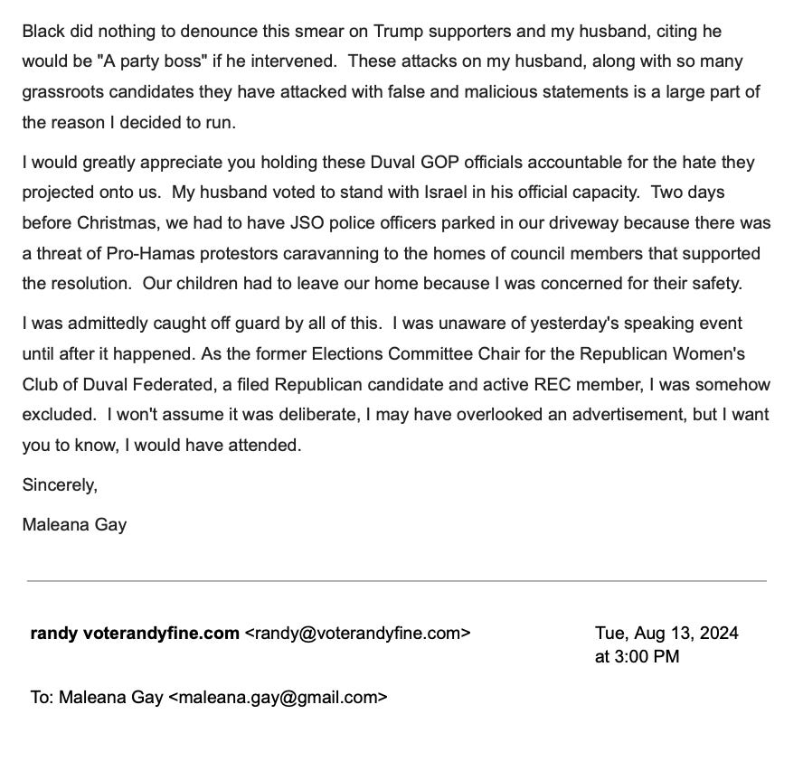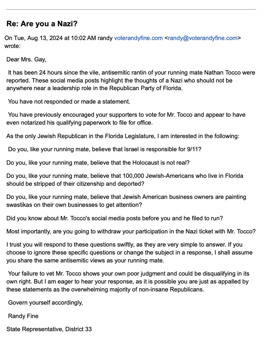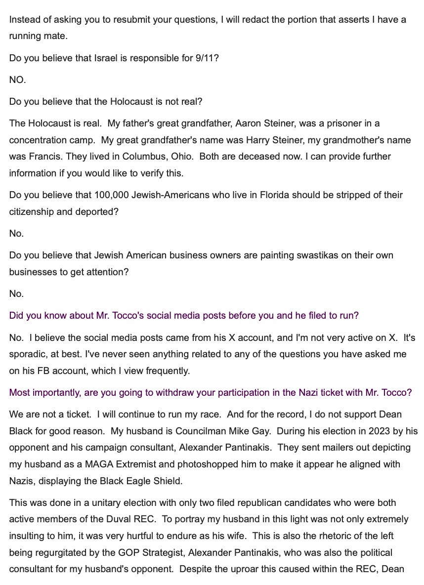 He has a record, when it comes to these local politics issues, of engaging in antisemitism accusations with all the restraint and attention to detail of a drive-by shooter. Here’s an example of him doing it in the past in Duval County in 2024, the point of this is to show the playbook. Think about how deranged it is to email the great grandchild of a Holocaust survivor in all caps, “ARE YOU A NAZI?”: