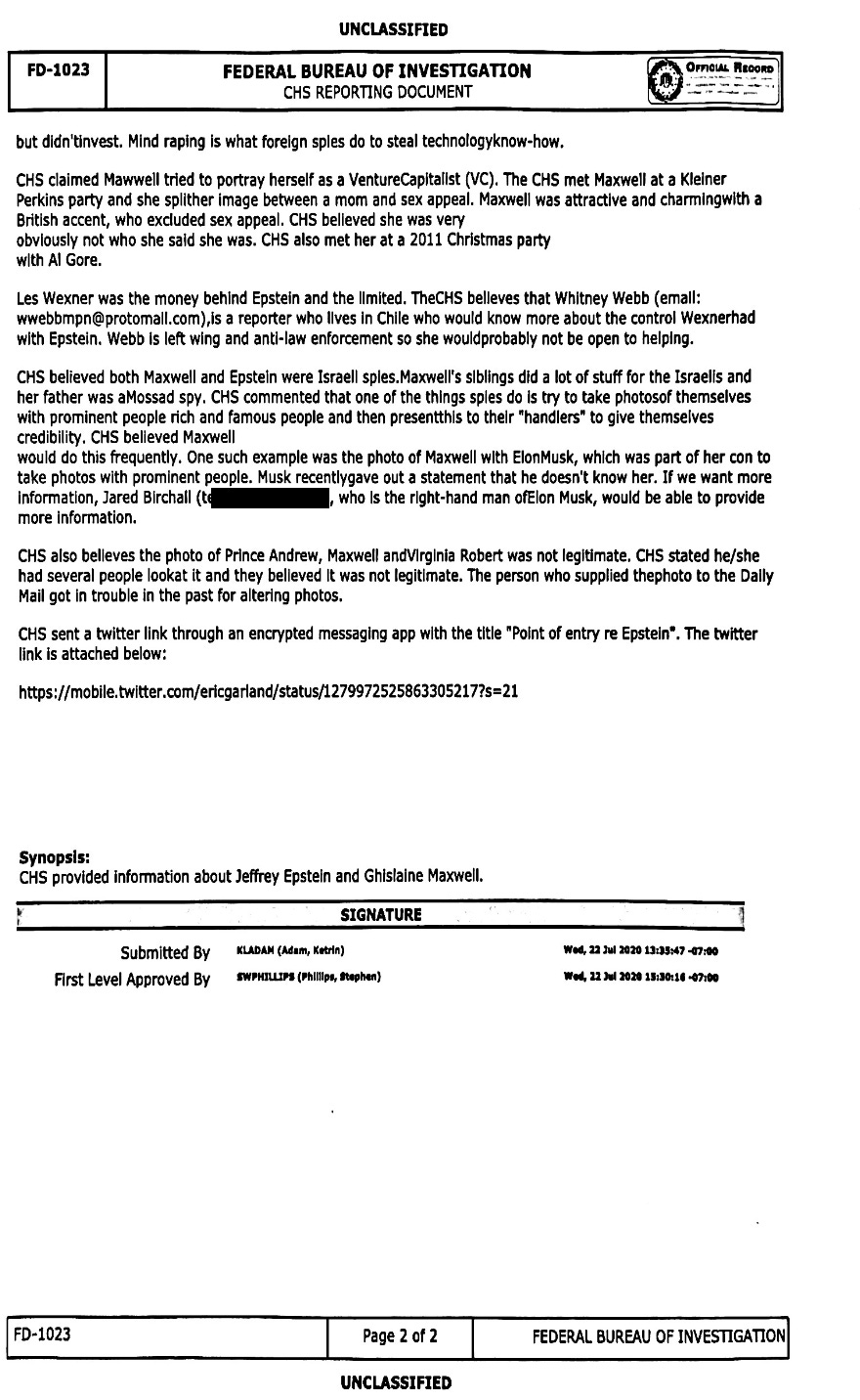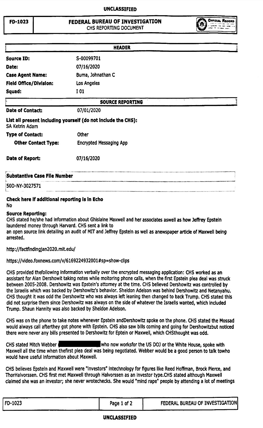 One of Charles Johnson's FBI Informant Reports Pertaining to Ghislaine Maxwell