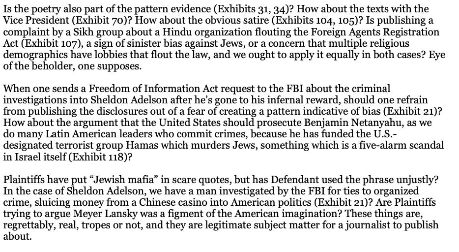 In any case, the plaintiffs contend I have very maliciously pointed all this out because I hate Jews. In support of the notion that I hate Jews, they intend to call Stephen Coughlin, a senior fellow at the Center for Security Policy, which has been designated a hate group by the Southern Poverty Law Center.