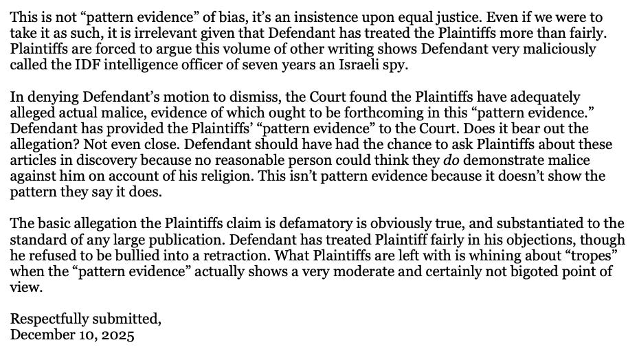 The first paragraph of the first article about Israel I wrote after 10/7, now submitted as an exhibit, reads: